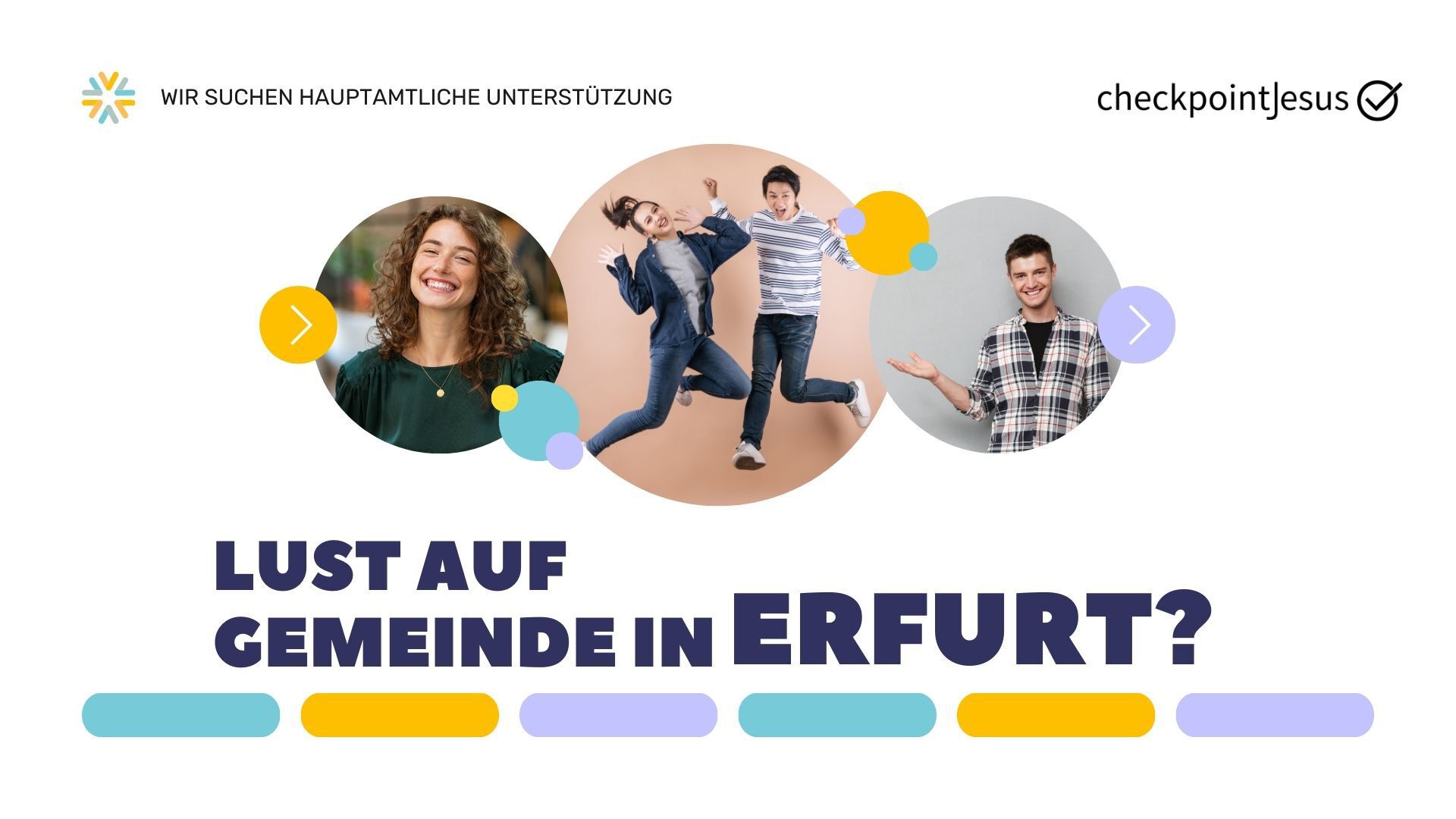 Der checkpointJesus ist ein Ort für Menschen in Erfurt. Hier treffen sich Singles und junge Familien, Werktätige, Studierende und viele andere. Dazu gibt es ein aktives Gemeindeleben in Teams und Kleingruppen. Wir teilen Leben und Glauben miteinander und haben die Vision, sichtbar wie eine „Stadt auf dem Berg“ zu sein. Das heißt für uns, das Evangelium sichtbar werden zu lassen, lebendig zu vermitteln, und Menschen in eine persönliche Beziehung zu Jesus einzuladen.